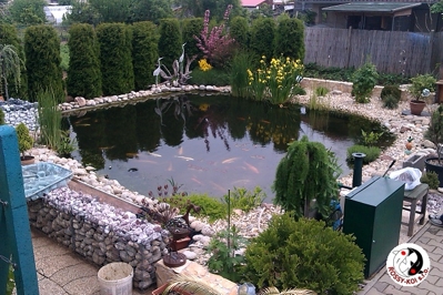 Záhradné jazierko s rybami, realizácia Október 2013. Objem jazierka 27 m3. Jazierko bolo založené už dávnejšie. Pre pretrvávajúce problémy spôsobené nedostatočným odkalovaním bola do jazierka dodatočne inštalovaná dnová vpusť 110 mm a skimmer Oase AquaSkim Gravity, napojené potrubím na čerpadlovú šachtu. Do systému bola inštalovaná aj výkonnejšia UV lampa TMC ProClear 110 W. Pred tým bola v systéme nainštalovaná UV lampa s výkonom 36 W, ktorá pre jazierko nebola postačujúca.